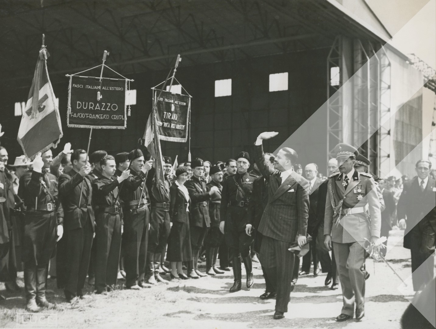 "Luce", 1937, Ministri Galeazzo Ciano në aerodromin e Tiranës, i ndjekur nga autoritete politike dhe ushtarake italiane dhe shqiptare, duke kaluar në revistë përfaqësinë e Durrësit të Fashiove italiane jashtë vendit, print në letër, 17.5 x 23 cm.