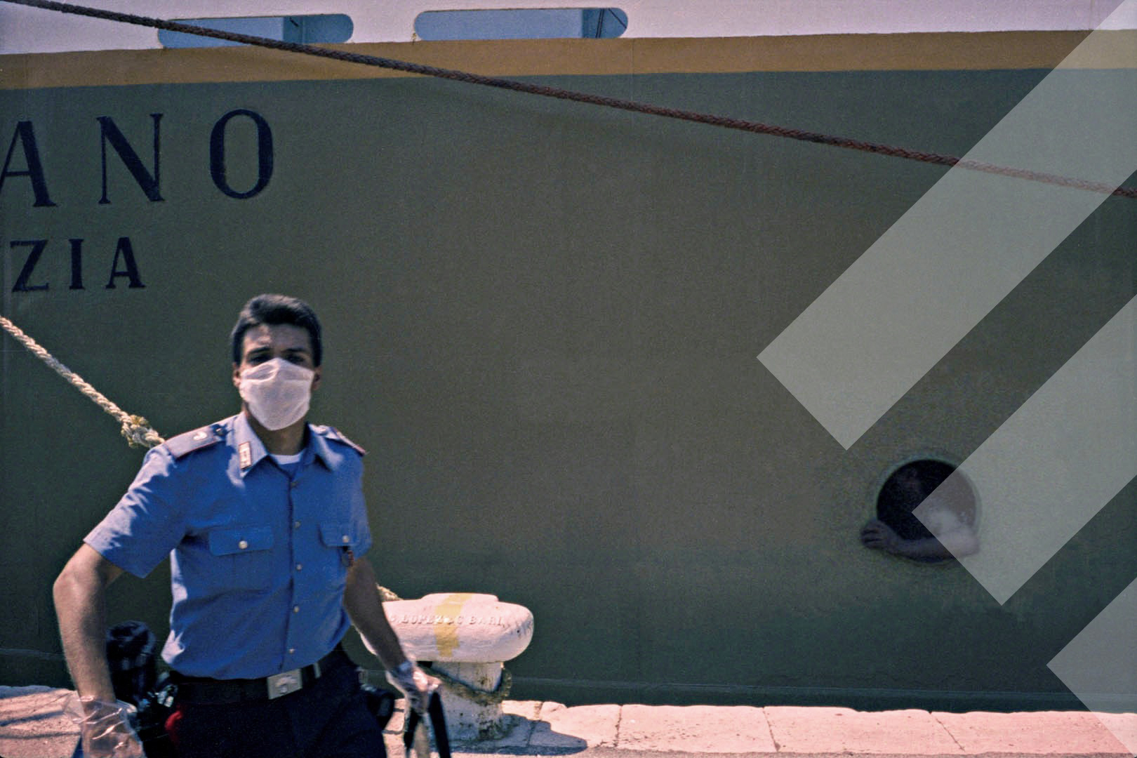 Giovanni Ruggiero, 1991, Momente nga mbërritja e anijes "Vlora" në portin e Barit, negativ, 35 mm.