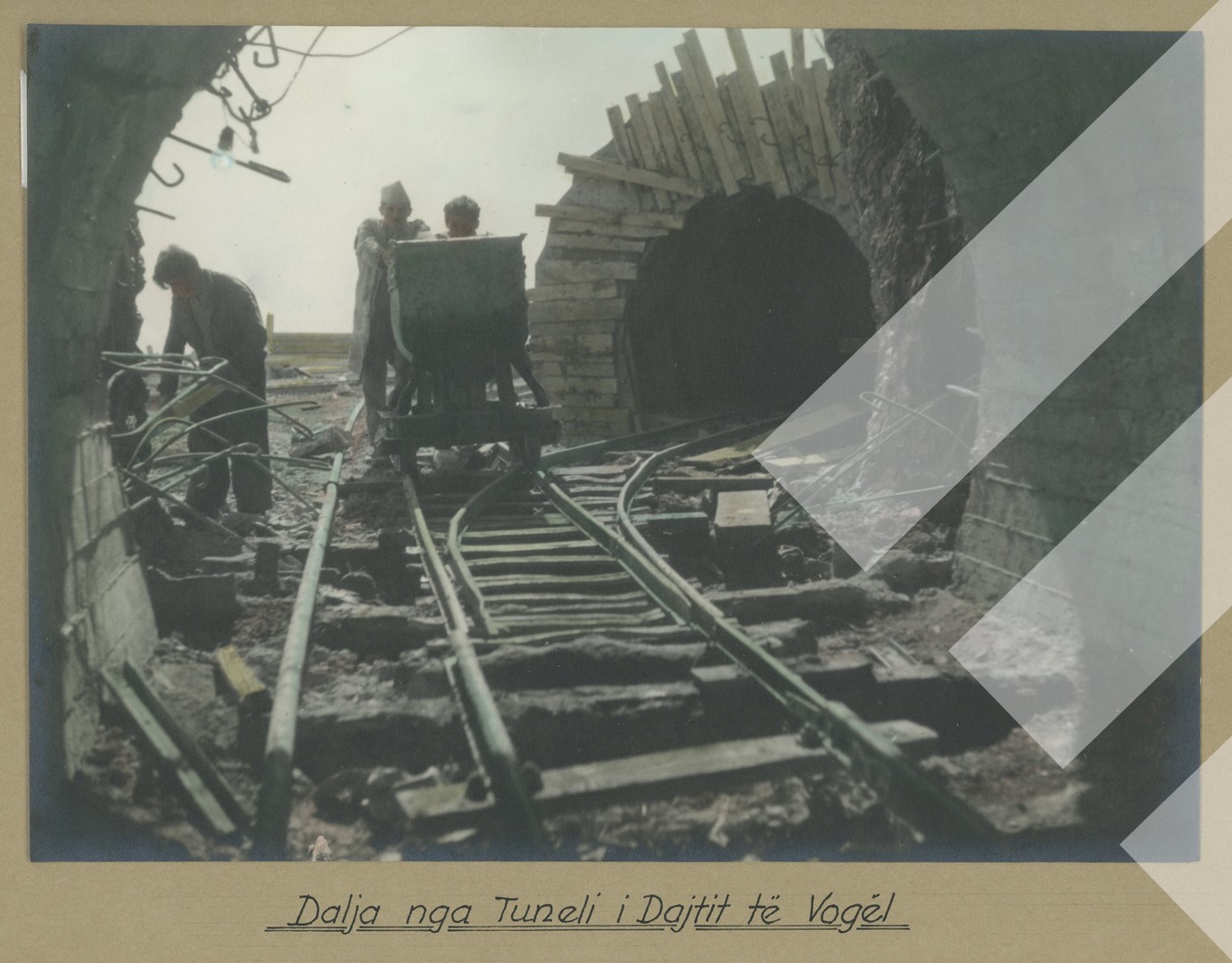 I panjohur, 1951, Punime gjatë ndërtimit të hidrocentralit "LENIN". Dajt, Tiranë. Print në letër i ngjyrosur me dorë, 24.5 x 17 cm.