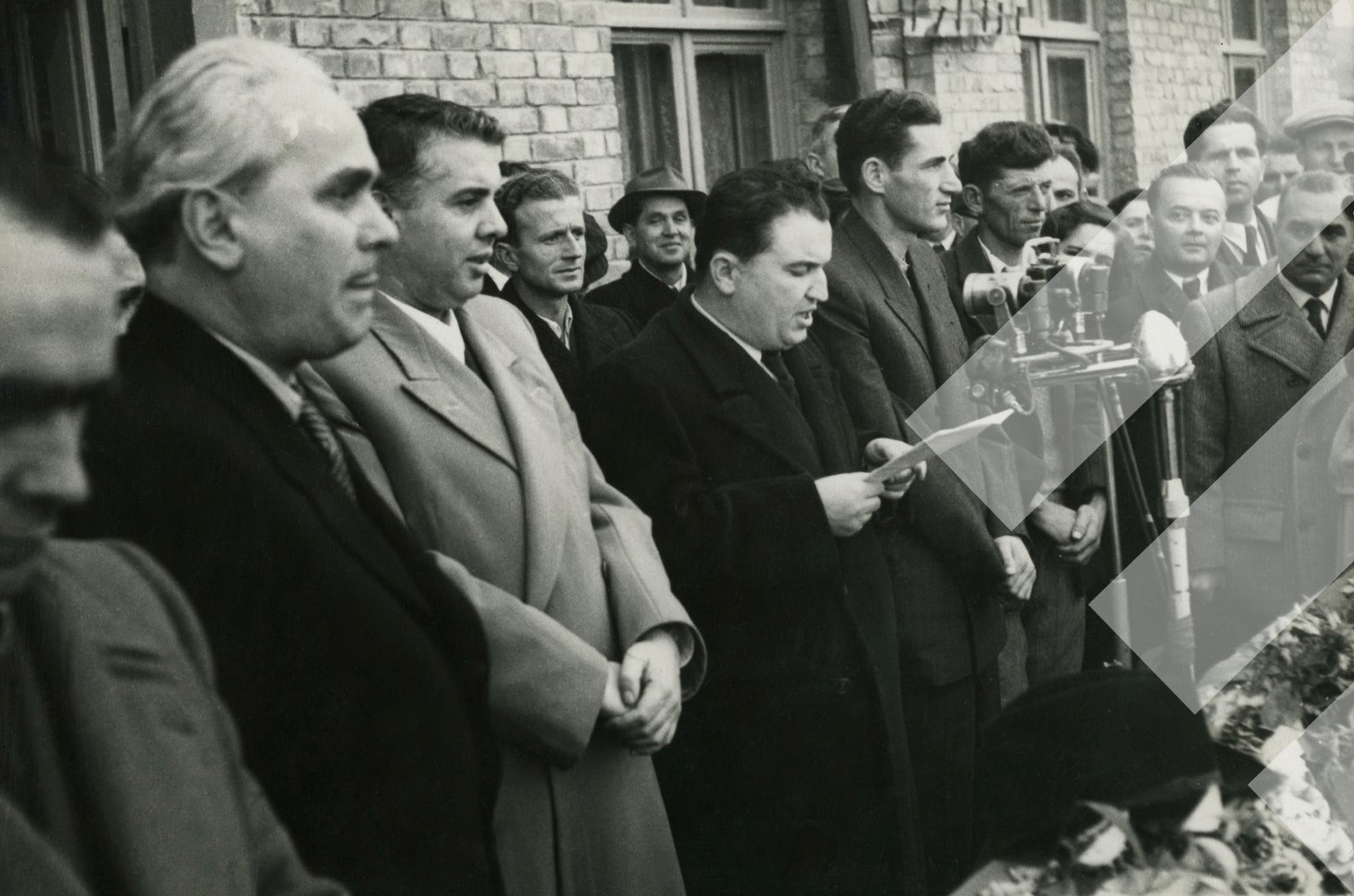 I panjohur, 1951 Zv Kryeministri Gogo Nushi duke mbajtur fjalim në ceremoninë e inagurimit të fabrikës së sheqerit "8 Nëntori" në Maliq të Korçës, Print në letër, 9 x 13 cm.