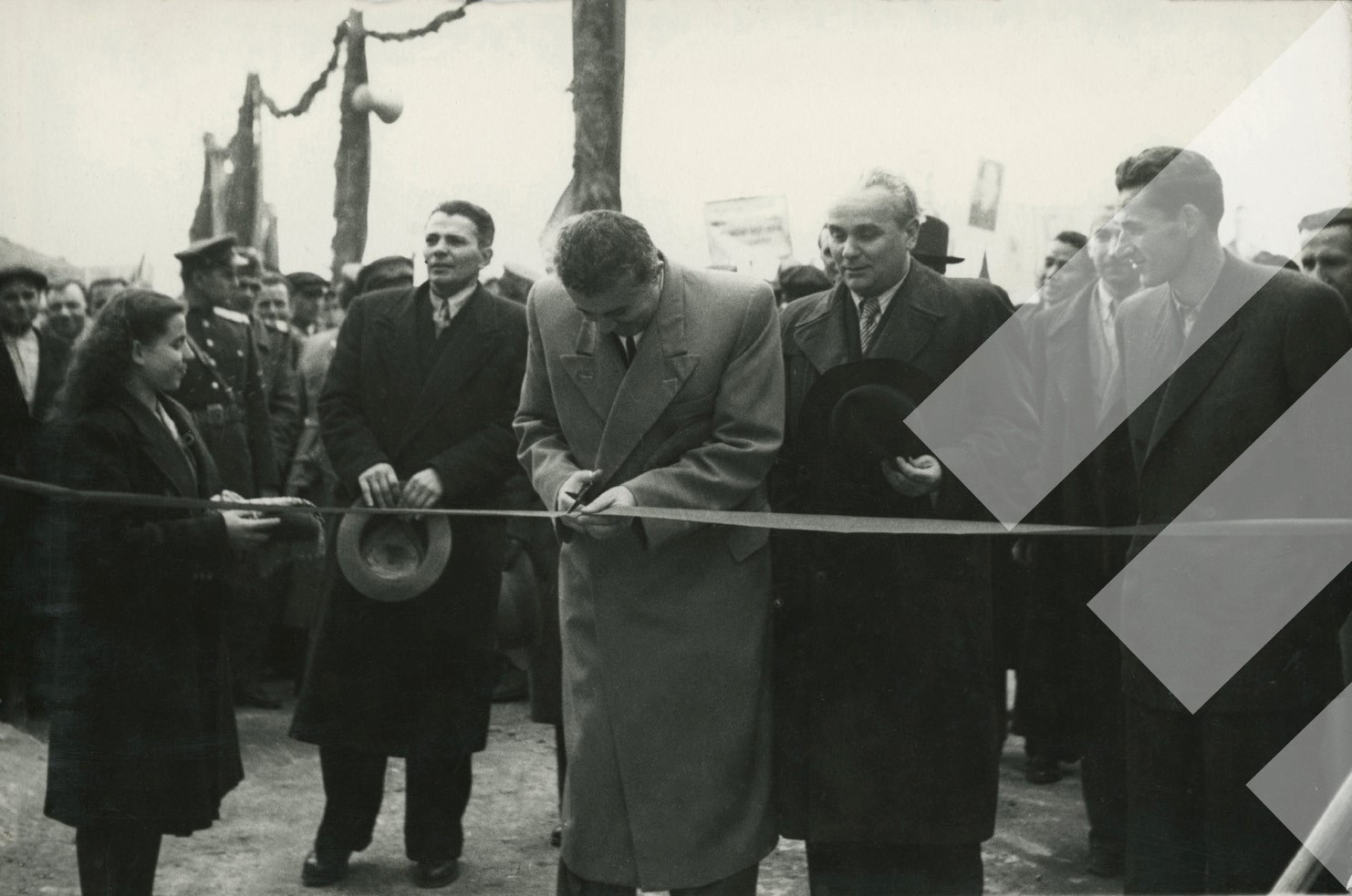 I panjohur, 1951 Prerja e shiritit nga Enver Hoxha në inagurimin e fabrikës së sheqerit "8 Nëntori" në Maliq të Korçës, Print në letër, 9 x 13 cm.