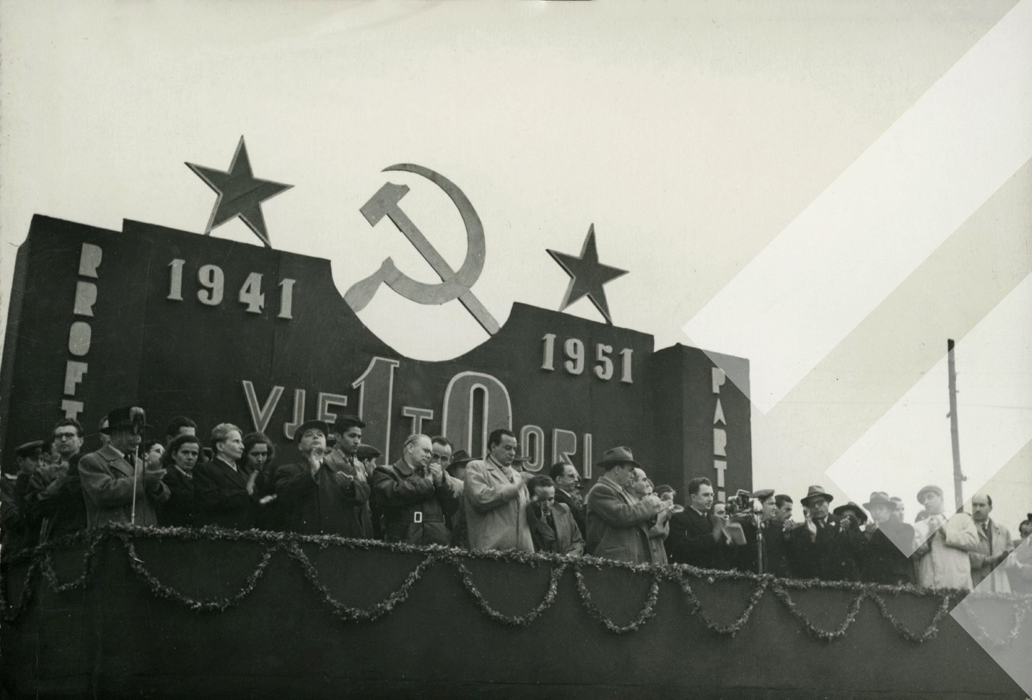 I panjohur, 1951 Tribuna e festimeve të 10 vjetorit të themelimit të partisë në qytetin e Korçës Print në letër, 9 x 13 cm.