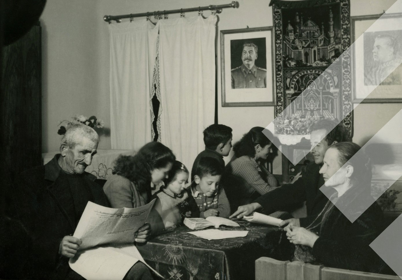 I panjohur, 1951 Familje duke ndjekur lajmet, Print në letër, 9 x 13 cm.