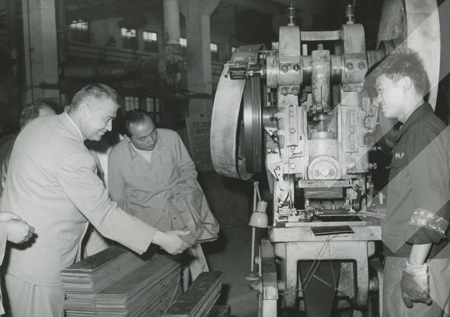 I panjohur, 1960, Kryetari i Presidiumit të Kuvendit Popullor, Haxhi Lleshi gjatë vizitës në një fabrikë të elektromotorëve, Shangai print në letër, 15 x 21 cm.