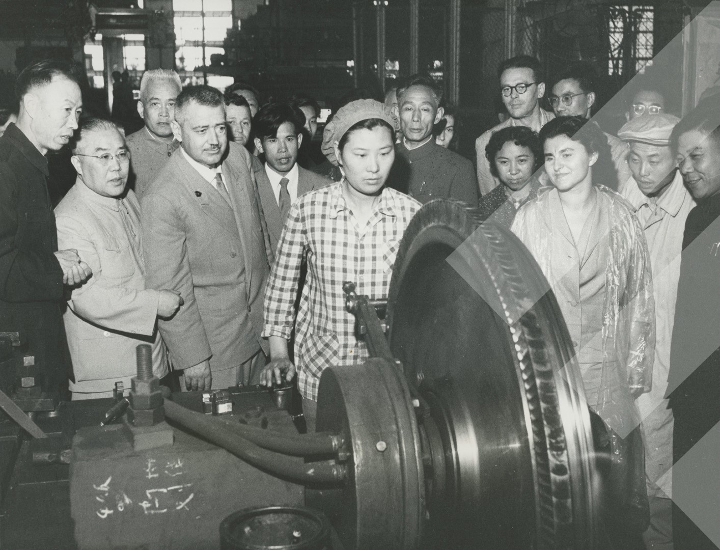I panjohur, 1960 Kryetari i Presidiumit të Kuvendit Popullor, Haxhi Lleshi në uzinën e turbinave në Shangai print në letër, 15 x 20 cm.