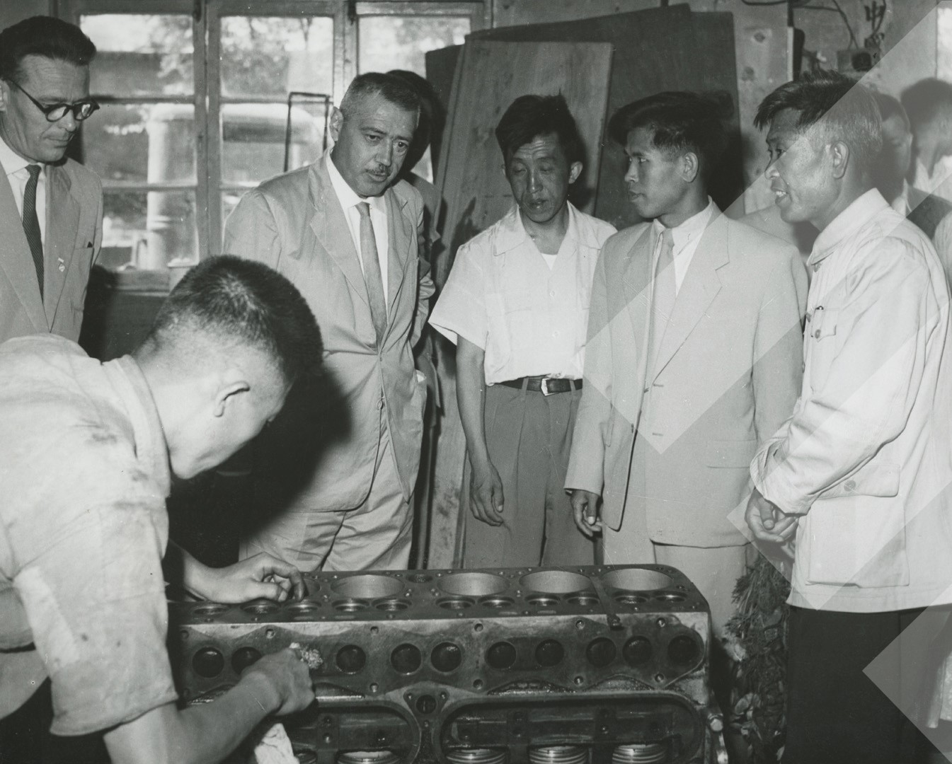 I panjohur, 1960 Kryetar i Presidiumit të Kuvendit Popullor, Haxhi Lleshi viziton uzinën për remontin dhe montimin e motorëve diezel në komunën popullore print në letër, 15 x 18 cm.