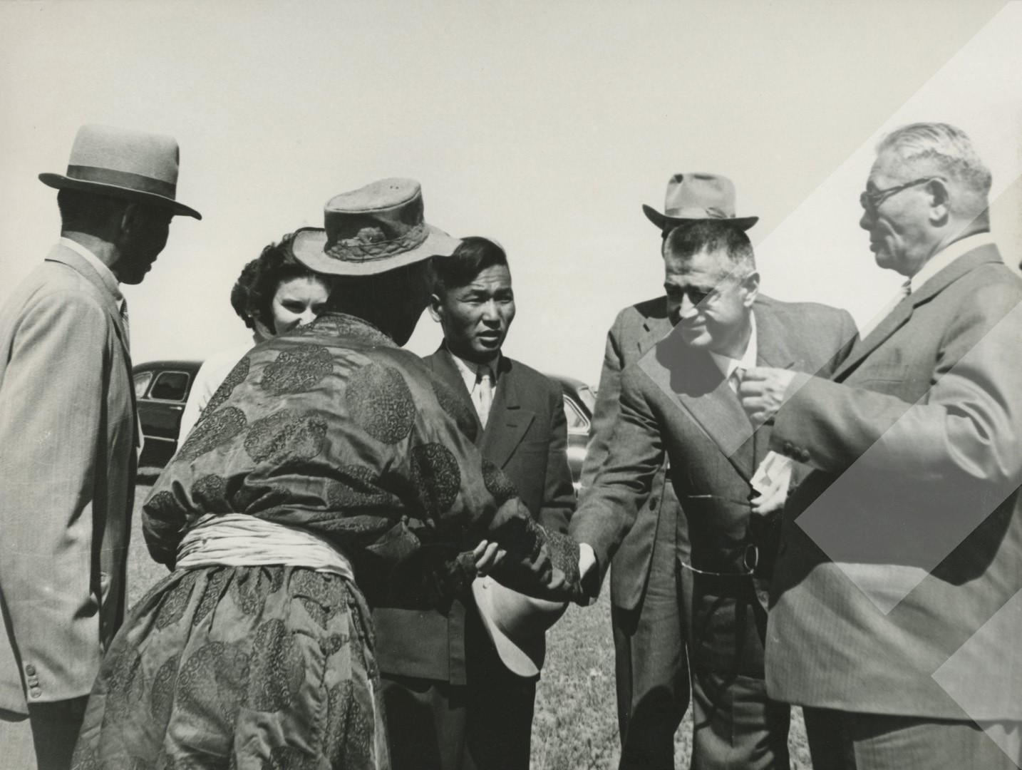 I panjohur, 1960 Kryetari i Presidiumit të Kuvendit Popullor, Haxhi Lleshi dhe Liri Belishova, anëtare e Byrosë Politike, gjatë vizitës në Republikën Socialiste të Mongolisë print në letër, 15 x 24 cm.