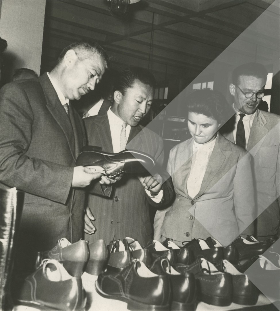I panjohur, 1960 Kryetari i Presidiumit të Kuvendit Popullor, Haxhi Lleshi dhe Liri Belishova, anëtare e Byrosë Politike vizitojnë një fabrikë këpucësh në Republikën Socialiste të Mongolisë print në letër, 18 x 24 cm.