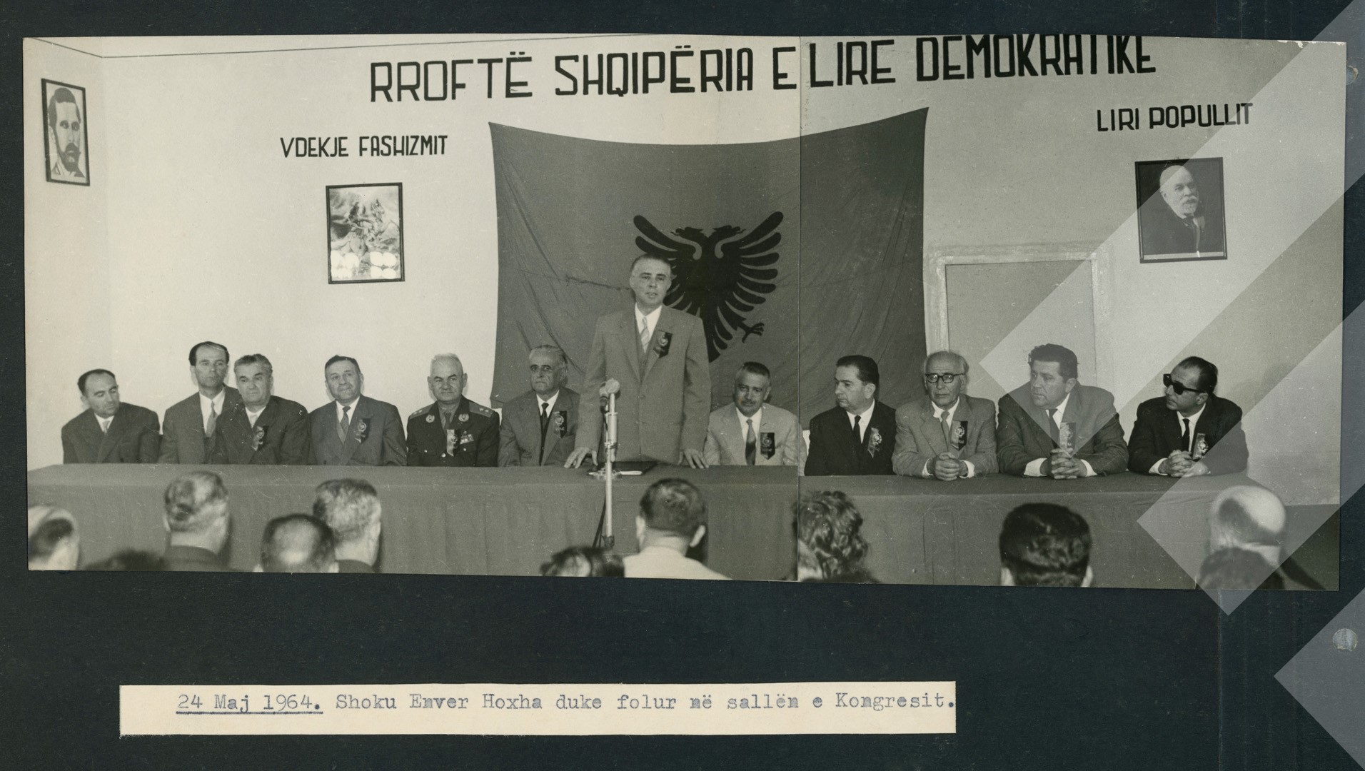 Pandi Cici 1964 Enver Hoxha duke folur në sallën historike të Kongresit print në letër, 12 x 28 cm.