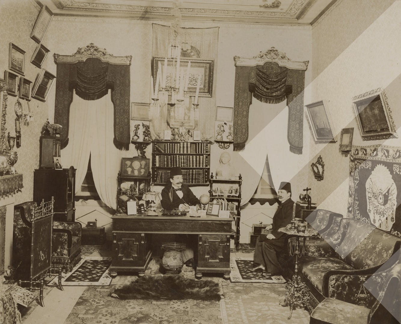 Fotografia në studion e punës (fig.2) paraqet në detaje mahnitëse mobiljet, sendet dhe koleksionet e shumta të fermanëve, armëve dhe ojekteve arkeologjike të Syrja Beut, i cili pozon i ulur në skrivaninë e tij, me në krah Xhelaledinin, një tjetër personzh emblematik i kohës.