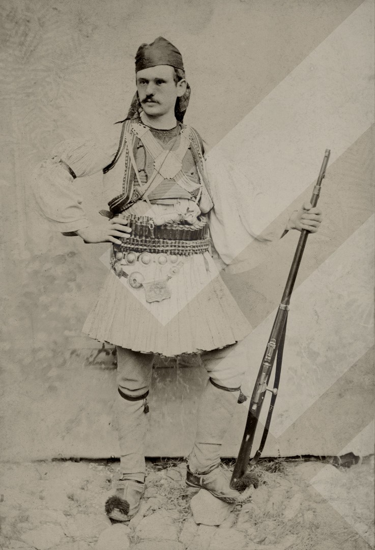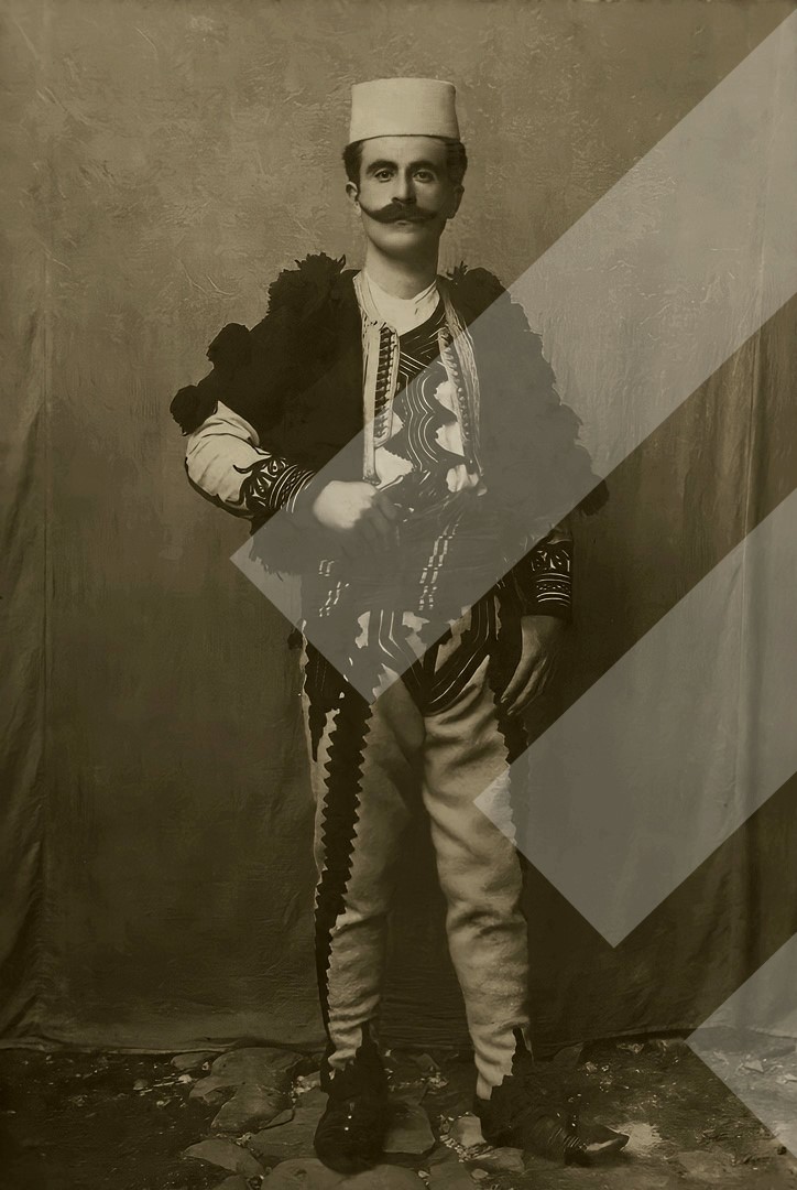 Edhe autoportreti i vitit 1908, bërë në Tiranë, në pozë si luftëtar me pushkë në dorë, veshur me rroba tradicionale të Shqipërisë së Veriut [fig.11] përvijon atë lloj portretizimi konvencional të kthyer në modë, një model i përsëritur fotografik të cilin e hasim ngado në këtë periudhë. Kjo mënyrë paraqitjeje vringëllon për herë të fundit (përpara se të humbte përparësi dhe të kthehej në subjekt argëtimi më pas) traditat, zakonet dhe normat e ‘kores së sipërme’ mbizotëruese të popullatës shqiptare të fillimeve të shek. XX. Gati një etalon paraqitjeje, ku klasa, trimëria dhe sedra e burrit mishërohej përmes stolisjes së shtrenjtë të petkut krahinor, armëmbajtjes dhe në të shumtën e herëve mustaqeve, simbolit të forcës, kurajës dhe virilitetit, të cilat mund të shtoheshin apo zgjateshin sipas kërkesës së klientit, thjesht përmes një gërvishtjeje të hollë mbi pllakën e xhamit negativ.