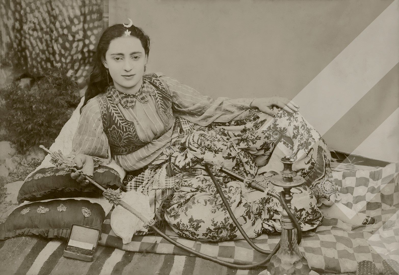 Me mjaft interes gjithashtu na shfaqet edhe fotoja e çingijes së famshme ‘Tushi’[fig.12], femrës bukuroshe që zbaviste pasunarët e dikurshëm të Elbasanit. Shtrirë mbi qilim si një odalisk haremi, mbështetur mbi jastëkë të qëndisur, me markuçin e nargjilesë së veshur me cohë të shtrenjtë në dorë, pozon e patrazuar me një buzëqeshje të lehtë, të pakapshme ngacmuese. Pranë saj një kuti e hapur duhani të fton për të shkëmbyer dy fjalë si prelud i një flirti.
