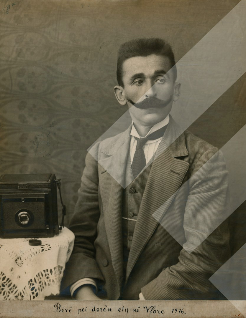 Te vetëportreti shumë i njohur, me aparatin fotografik pranë [fig.15], në fund të fotos, fatmirësisht ka shpëtuar shënimi; ‘Bërë pei dorën etij në Vlore 1916’, indicie kjo që na bën me dije se në mesin e Luftës së Parë ndodhej në Vlorë, në zonën italiane të pushtimit.